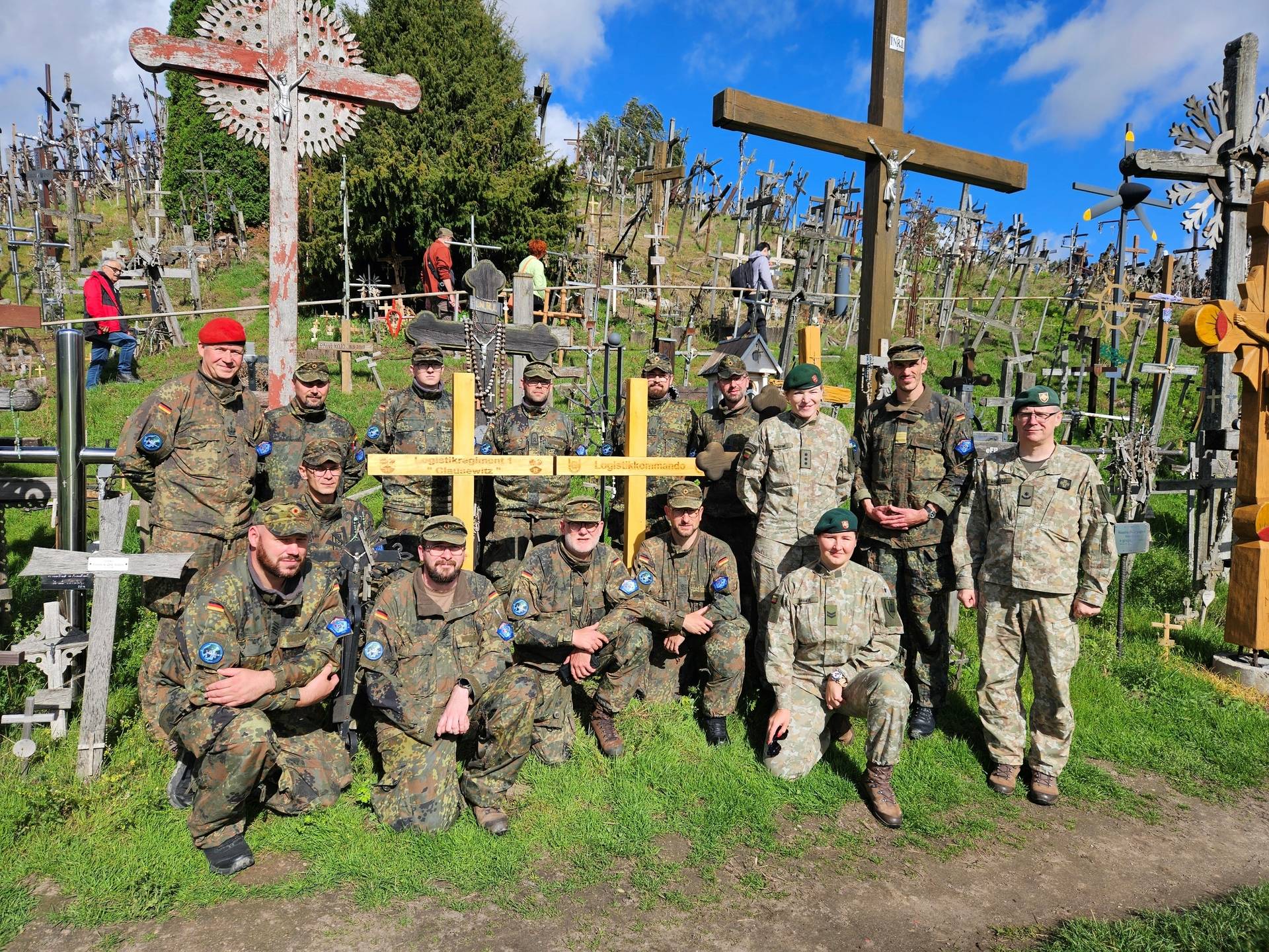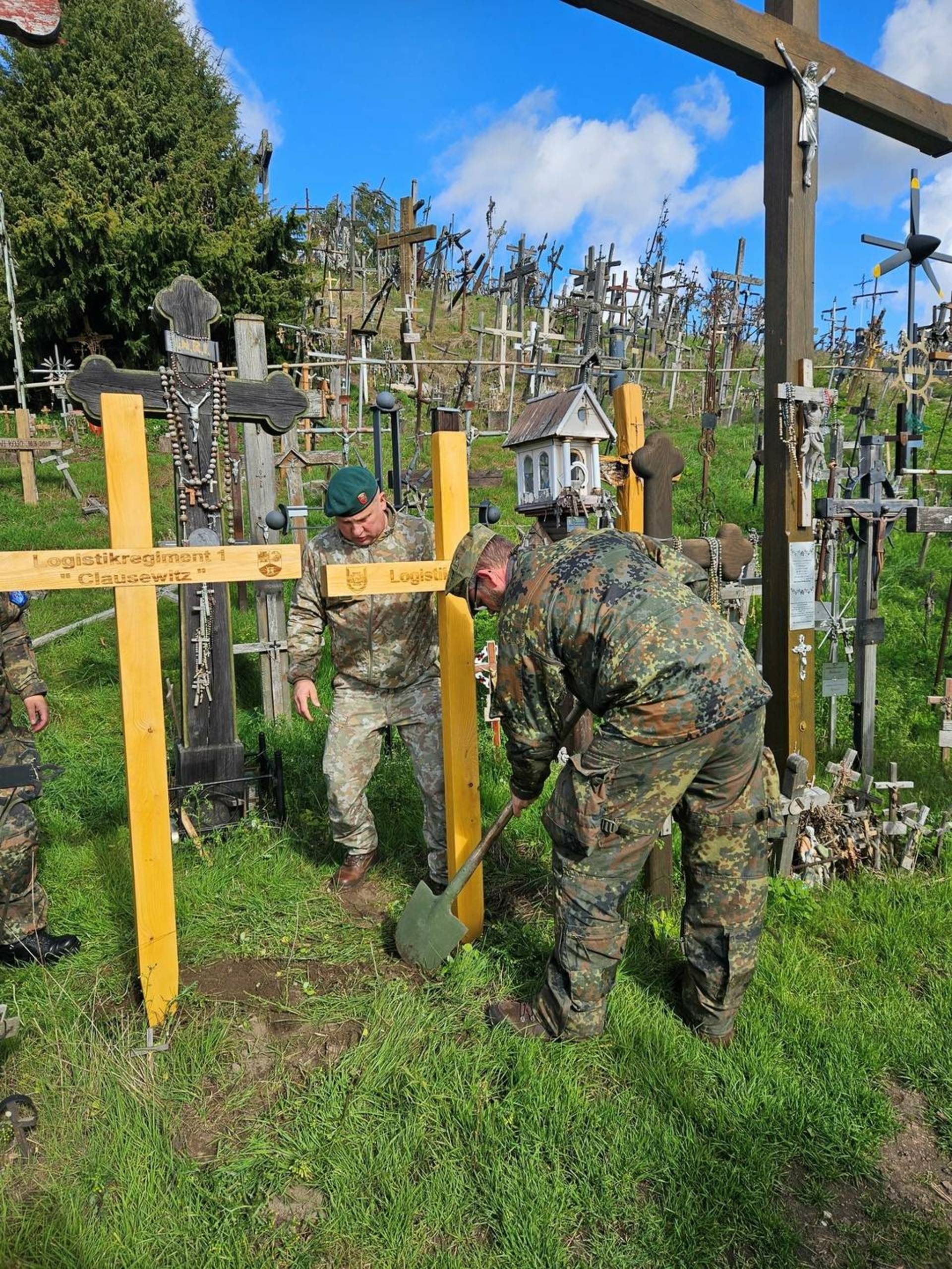 Today, two new crosses appeared on the Hill of Crosses near Šiauliai, where over 200,000 crosses, chapels, statues of saints, and religious images already stand. They were erected by German soldiers from Logistics regiment 1 participating in the exercise Brave Blue 2025, together with soldiers of the Military Commandants' Command.