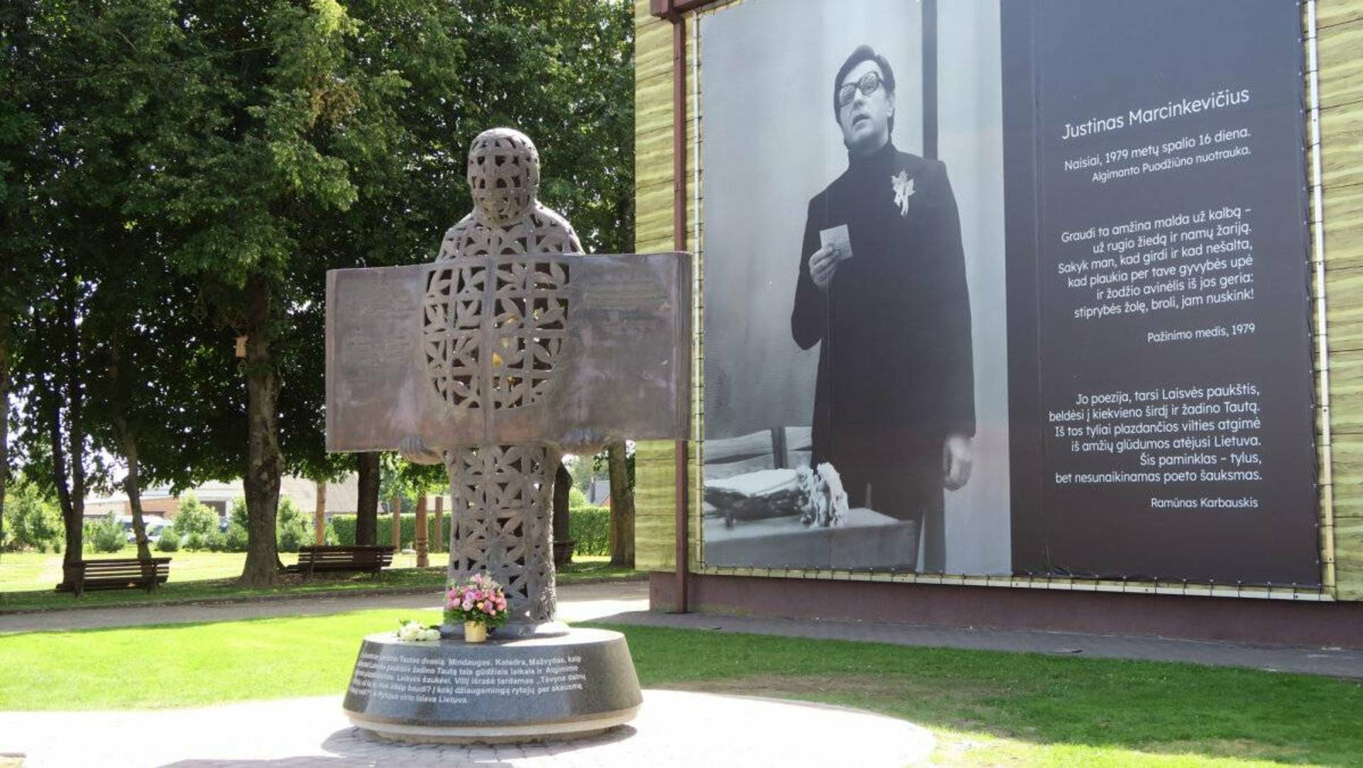 Bronzinė skulptūra poetui Justinui Marcinkevičiui atminti iškilmingai atidengta 2025 m. rugpjūčio 15 d., Žolinės šventės metu. Paminklą atidengė skulptūros autorius Kęstutis Musteikis ir paminklo fundatorius, kultūros mecenatas Ramūnas Karbauskis. „Čia nėra konkrečiai portretas, bet yra simbolis poezijai, žmogui,“ – atidengiant paminklą kalbėjo vilnietis skulptorius Kęstutis Musteikis ir pridūrė, jog skulptūra palieka žmonėms daug vietos interpretacijai ir fantazijai. Paminklo fone poeto Justino Marcinkevičiaus didžiulė nuotrauka, kurioje Algimantas Puodžiūnas įamžino poetą, kai jis 1979 metai lankėsi Naisiuose ir skaitė savo eilėraščius.