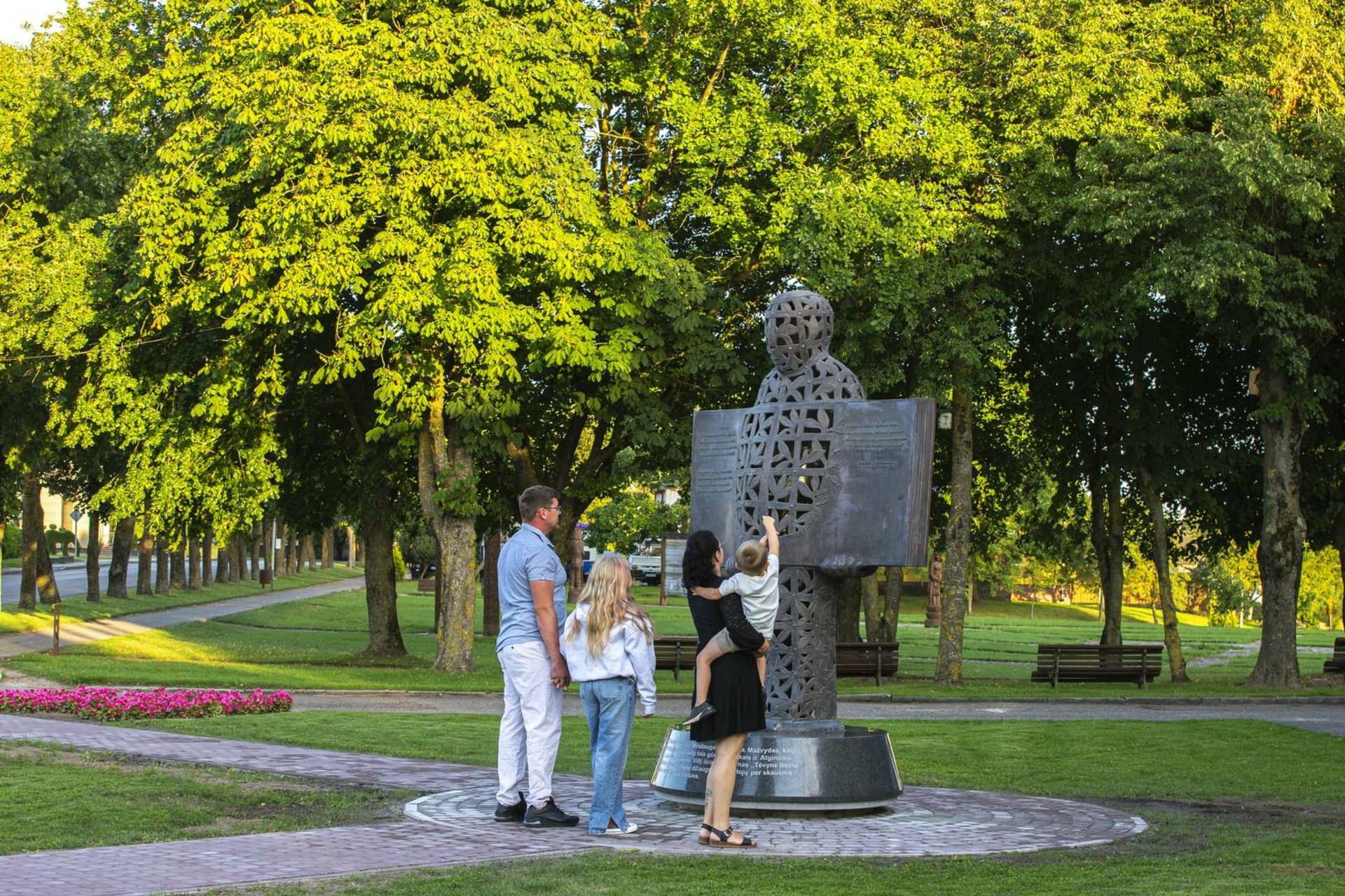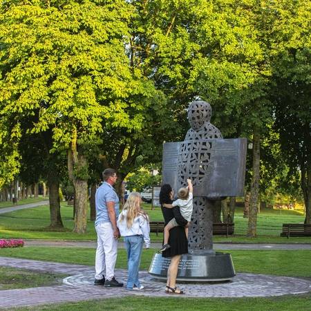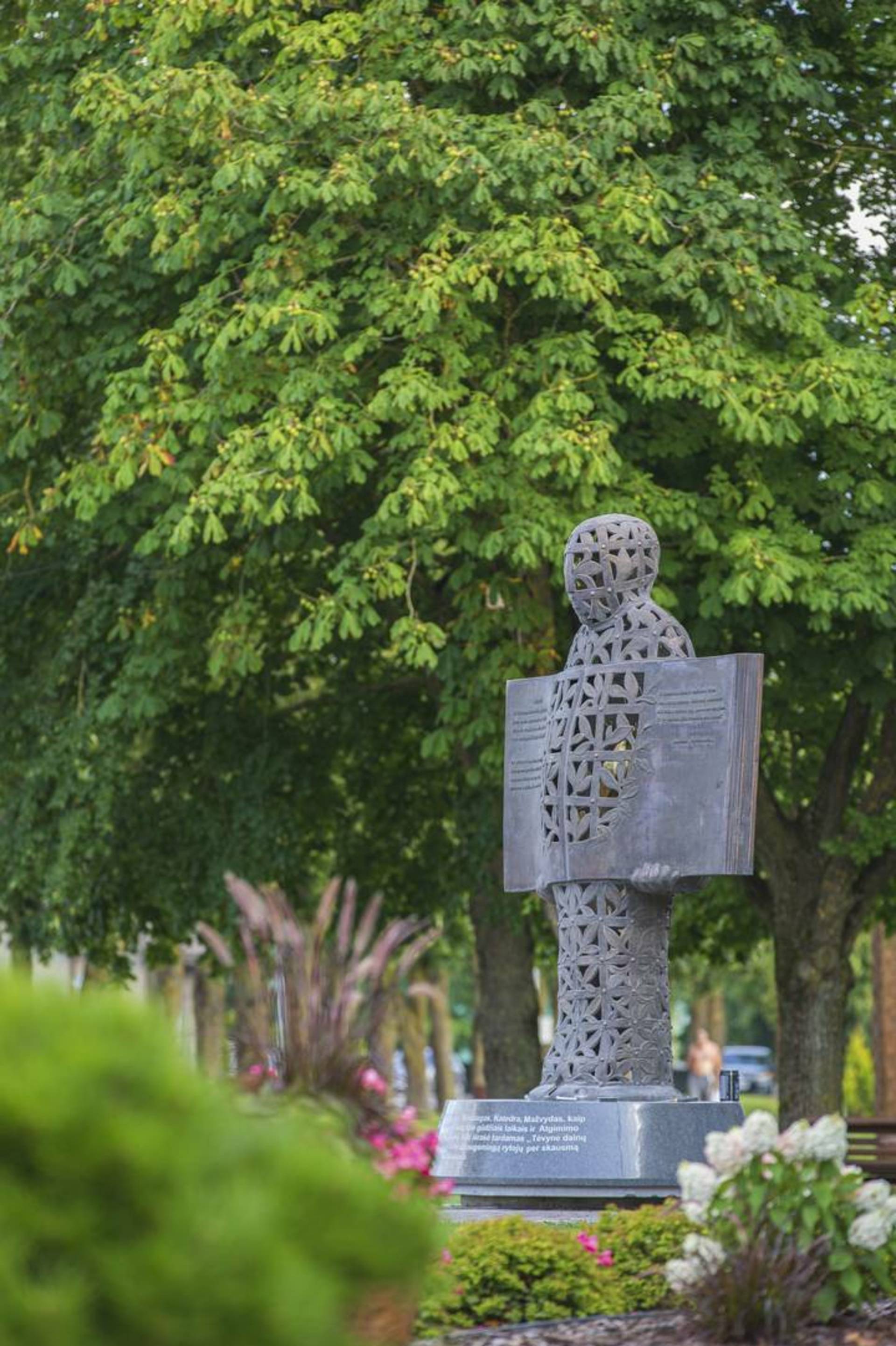 2,6 metrų skulptūra ant granito postamento vaizduoja žmogų – narvą, kurio viduje gieda paukštis. Ji buvo liejama apie 8 mėnesius. Skulptūra techniškai sudėtinga, matosi ir meno kūrinio vidus, todėl liejamos abi pusės. Skulptūros autorius Kęstutis Musteikis skulptūroje pavaizdavo žmoguje paukštį, su aliuzija į lakštingalą, į Justino Marcinkevičiaus eilėraštį „Tai uždaryk mane, tėvyne, savyje“.