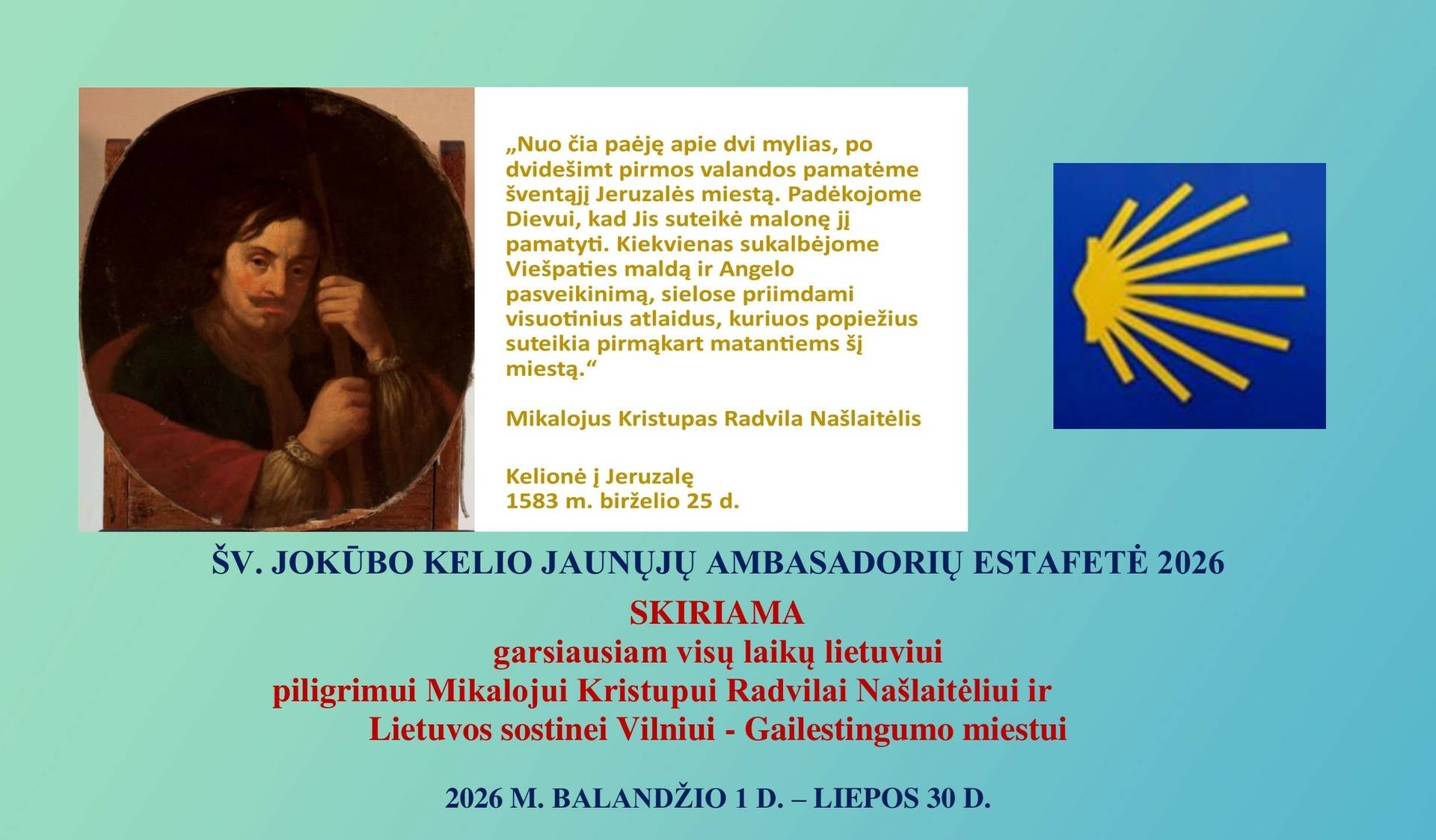 2026 metų balandžio 1 d. – liepos 30 d. kviečiame prisijungti prie jau tradicija tapusios Šv. Jokūbo kelio jaunųjų ambasadorių estafetės, kuri šiemet vyks jau vienuoliktus metus iš eilės. Ši iniciatyva skiriama garsiausiam visų laikų lietuviui piligrimui Mikalojui Kristupui Radvilai Našlaitėliui bei Lietuvos sostinei Vilniui – Gailestingumo miestui.