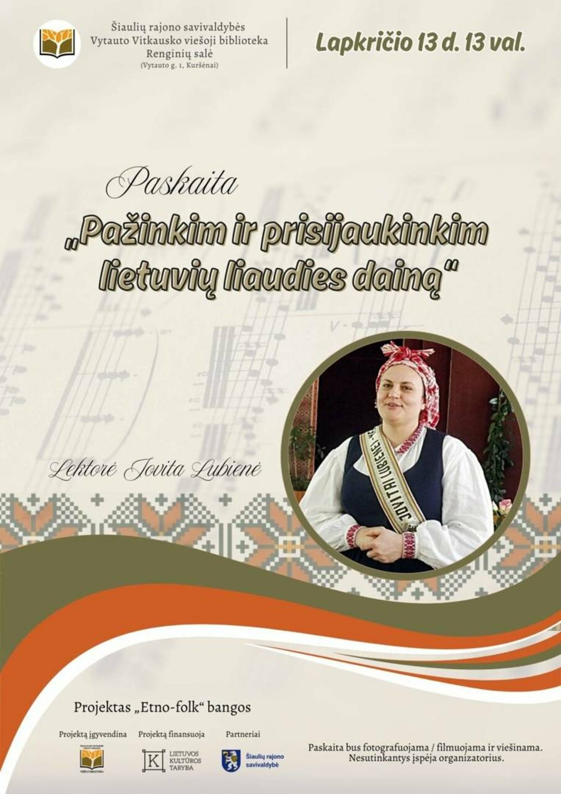 Šiaulių rajono savivaldybės Vytauto Vitkausko viešosios bibliotekos Renginių salėje vyks paskaita „Pažinkim ir prisijaukinkim lietuvių liaudies dainą“.