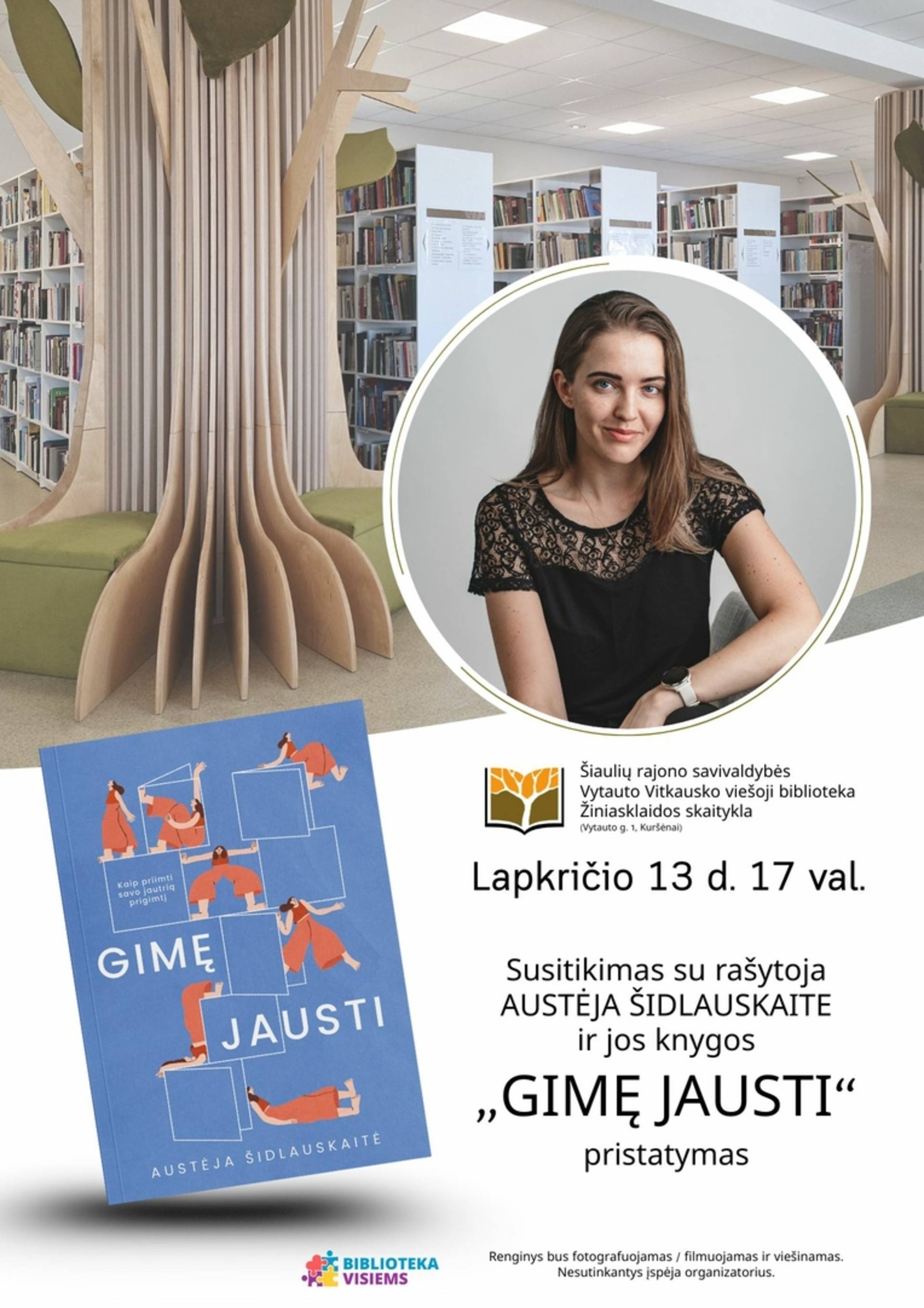 Susitikimas su rašytoja Austėja Šidlauskaite ir jos knygos „Gimę jausti“ pristatymas