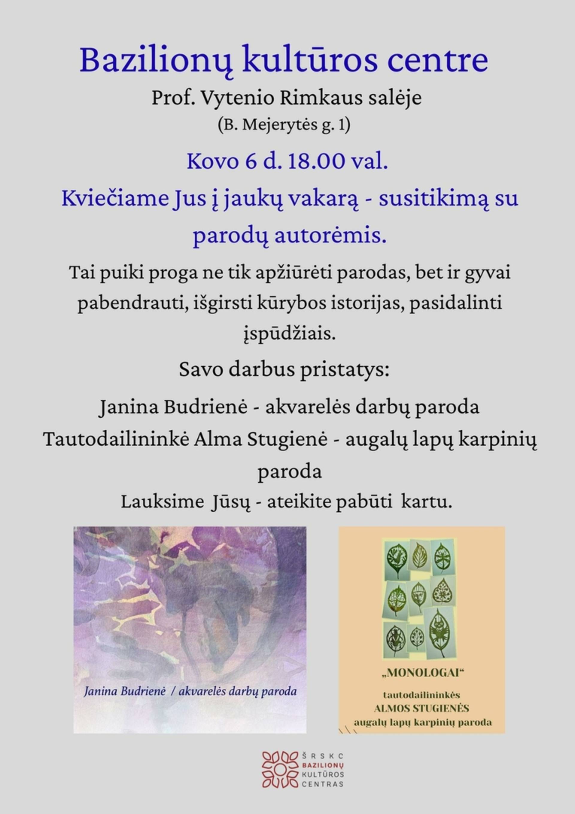 Vakaras-susitikimas su parodų autorėmis Janina Budriene ir Alma Stugiene