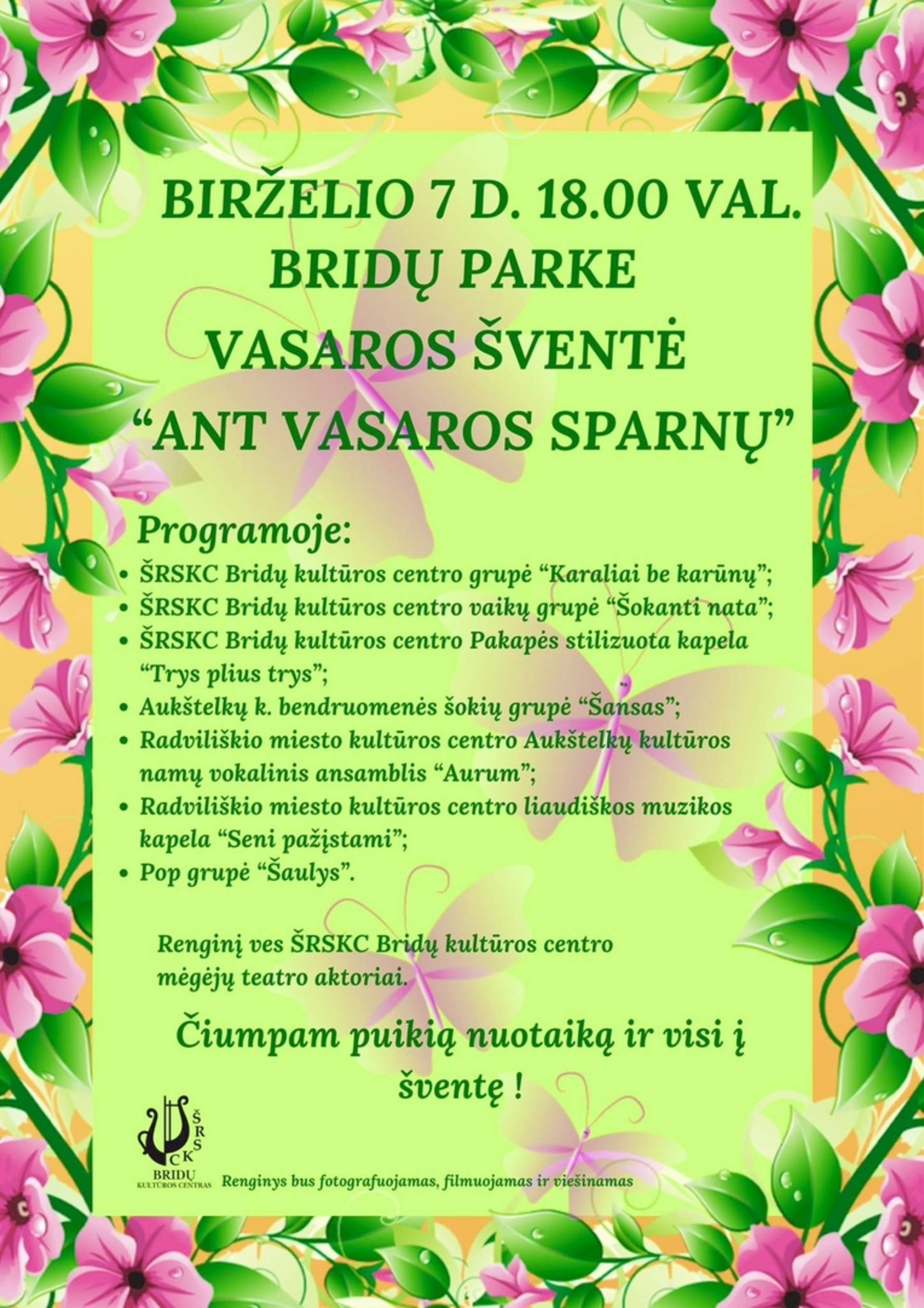 Dalyvauja: ŠRSKC Bridų kultūros centro mėgėjų teatras, grupė „Karaliai be karūnų“, vaikų grupė „Šokanti nata“, Pakapės stilizuota kapela „Trys plius trys“, Radviliškio miesto kultūros centro Aukštelkų kultūros namų vokalinis ansamblis „Vija“, šokių kolektyvas „Šansas“, Radviliškio m. kultūros centro liaudiškos muzikos kapela „Seni pažįstami“, grupė „Šaulys“.