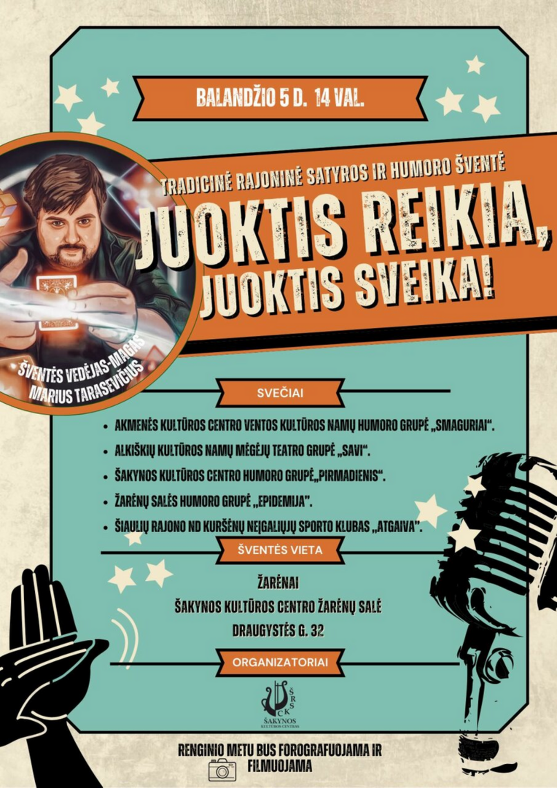 Dalyvauja: Akmenės kultūros centro Ventos kultūros namų humoro grupė „Smaguriai“, Alkiškių kultūros namų mėgėjų teatro grupė „Savi“, Šakynos kultūros centro humoro grupė „Pirmadienis“, Žarėnų salės humoro grupė „Epidemija“.